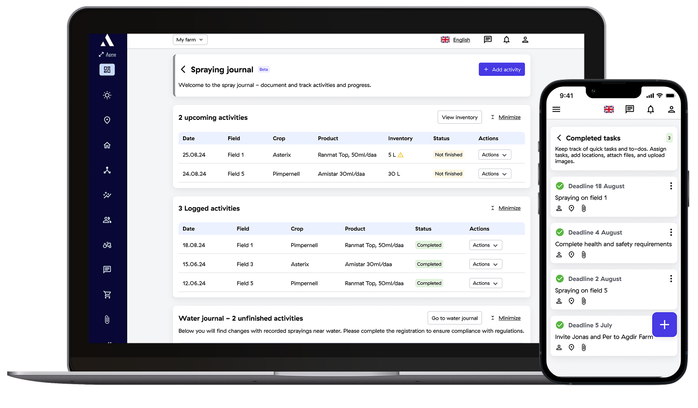 Log activities and access a full overview of your farm anytime directly from your phone or computer.