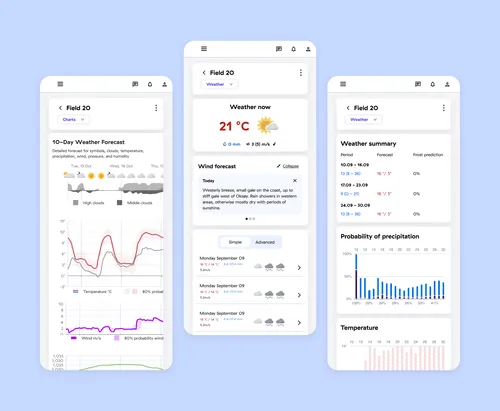 Get a detailed 21-day forecast with probability of precipitation and temperature trends. Easily see the likelihood of frost, heavy rain, or strong winds so you can take preventive measures and optimize your farming activities.