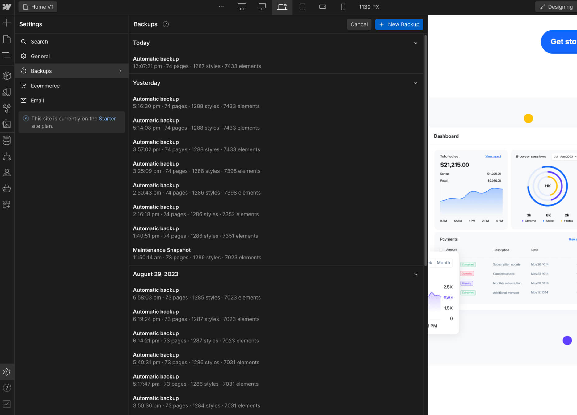 If something goes wrong, for example, if you are not liking where the website is going to, if you deleted some critical classes that were required to make the Template look nice, or if you just want to go to a previous version for any reason, you can always go to the Backups section.